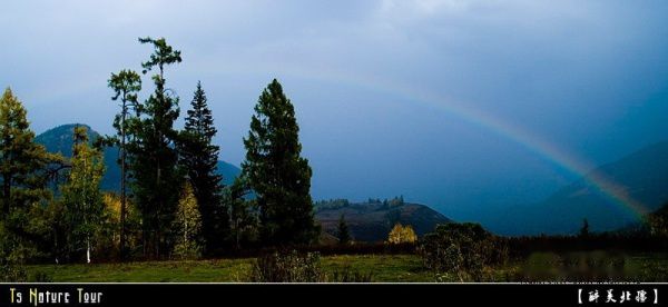 从半路客栈出发,一路上雨下了又停,停了又下,还好不算大,否则就惨了!虽然带了雨披,可是时断时续的雨已经让我们对在马背上穿了又脱感到厌烦!值得庆幸的是在一场急雨后总算云开日出,并在我们正前方的天空中架起一座美丽的彩虹桥,惹得我们又是一顿狂拍!