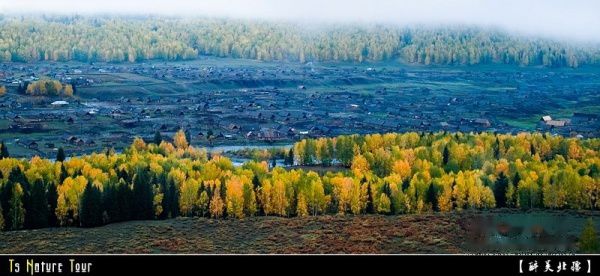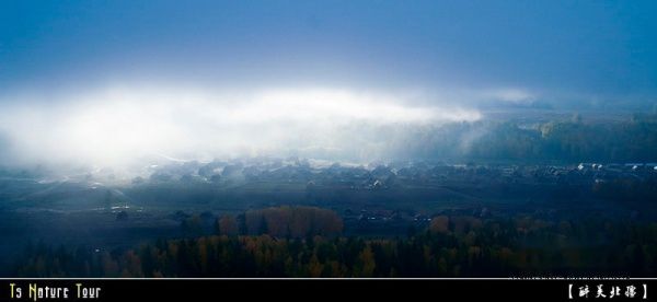 看来,是该收工的时间了,整理了一下器材,正找马夫,身后却传来一片惊呼声,回头一看,不知何时一片耀眼的天顶光突破厚厚的云层,照亮了大半个浓雾中的禾木村。还能说什么呢,拿出相机不停拍摄是现在唯一该做的事了。惊艳总是短暂的,天光再次被云层遮蔽,失去了阳光的禾木村在浓雾中如同褪了色的老照片一样。已经是9:00了,约好了司机11:00在收费口碰头的,早点回旅馆吧。