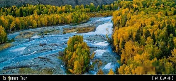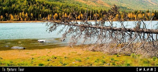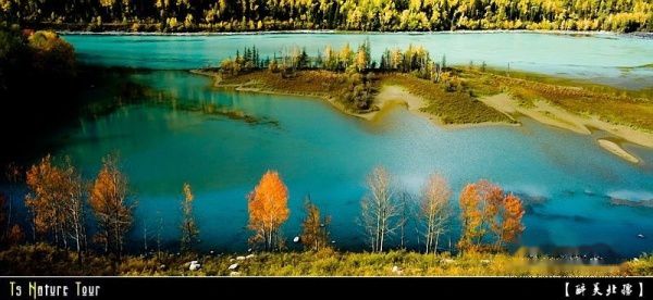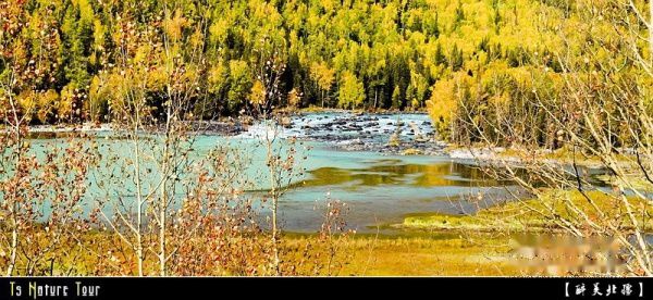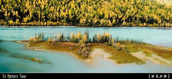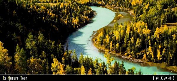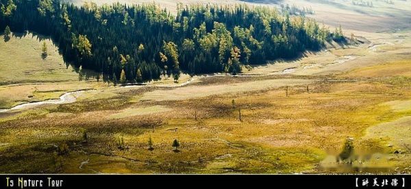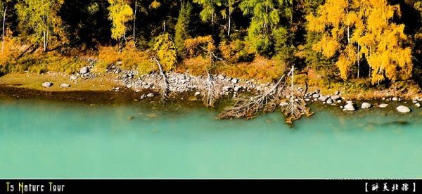 屁颠屁颠骑了不少路,屁股已经开始有点生疼;正走着,在一个下坡处眼前突然一亮,一弯蓝色的河水出现在视野中,耳边不时传来其他骑马的、徒步的游客的赞美,“哇,好漂亮!好美哦!”是在这里能听到的最多的言语。这应该是喀纳斯河与禾木河的交汇处,多么美丽的三角洲啊!在这里,谁也不会再理会向导是否同意下马,也不再理会身体的疲惫,每个人在不停地移动,不停地按动相机的快门,想从各个角度把这美轮美奂的景色珍藏在记忆中。