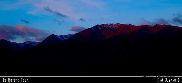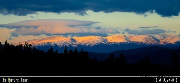 更远处雪山的山顶已经开始有阳光,被照得一片红,在深色云层的背景中,显得格外耀眼!