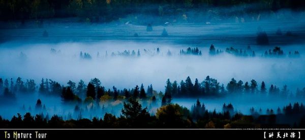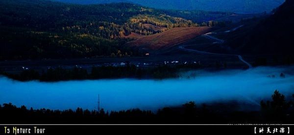 经过昨天一天的马背生活,今天步行到观景台是无法想象了,还是雇马上山吧,来回60元。没有还价,拿上器材直接跨上马儿上山。看来这匹马经常走这条道,根本不用牵引,自个儿就“嘀笃嘀笃”顺着马道上山了。到了观景台,发现人还不多,时间也还早,赶快挑了一个好一点的位置,坐下来吸上一根烟,慢慢等待日出。今天的雾非常大,放眼望去,一片白茫茫的,根本不知道前方有什么景色,也不知道禾木村究竟在哪个方向!等了不少时间,隐隐约约在雾气中露出几点亮光,应该是村里的灯光吧;浓浓的雾气从天上一直盖到地上,虽然已经能看到村子的轮廓,但日出是铁定没戏了!忽然,一阵风把眼前的一片浓雾吹散,天空也亮了许多,禾木村宛如一位蒙着面纱的年轻女子,微风拂开面纱的刹那间,露出了她那美艳的容姿。观景台上静得很,只有快门的“咔嚓”声不绝于耳。不知哪位突然间发出了一声赞叹,“哇,好美!像假的一样!”是啊,眼前的景色真得犹如画一般,静静地挂在面前,等着被欣赏。也就5、6分钟的时间,美丽的禾木村再次在浓雾中隐去。