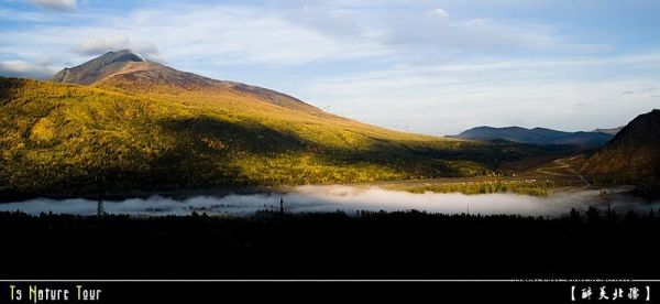 整个天池和对面的山峦都被一层薄薄的雾气笼罩着,池边点缀着几棵金色的白桦,除了练声的男子和我,天池边再无他人。抽着烟,我慢慢地欣赏着宁静的景色,悠然地取景拍照,静待日出。