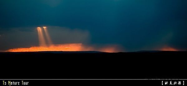 赶到五彩滩已经快19:30,而且多云,几近阴天,只在接近地平线的天空有几丝阳光钻出厚厚的云层,而缺少了阳光照射下的五彩滩只剩下一团团的黑影。不过,凭着多年摄影经验确定,今天的落日将与往日不同。挑选了一块平台,前景是有索桥的河面,等待着夕阳西下,期间好多人因为无法拍摄夕阳下的五彩滩而选择了离开。果不出所料,今天的日落非常美丽!远处山后黑黑的乌云,渐渐地被几缕阳光染得通红通红,好似被火烧着了一样;而河面更是映射着天空的色彩,显得五彩斑斓!