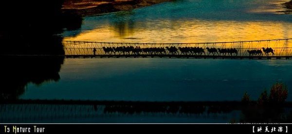 忽然拍摄的人群中发出一片呼声,原来是一队驼队小跑着通过索桥,留下了一幅美丽的剪影!
