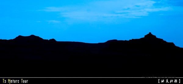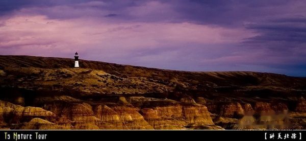 不一会儿,西边的天空完全被云层遮蔽,没有了动人的色彩,一回头,却发现东边的天空呈现出迷人的紫色,伫立在五彩滩上的那座灯塔,本与这里的景色格格不入,此时却将五彩滩打扮得如夕阳下海边一样。此时其实天空已经很暗了,由于没带脚架,遂利用妻的肩头作为固定点,调高ISO、开大光圈、开启机身防抖,拍下了几张尚算清晰的照片。由于在白哈巴无法充电、转移照片,在五彩滩最后基本靠删除之前不太满意的照片才保存到了一些不错的照片。