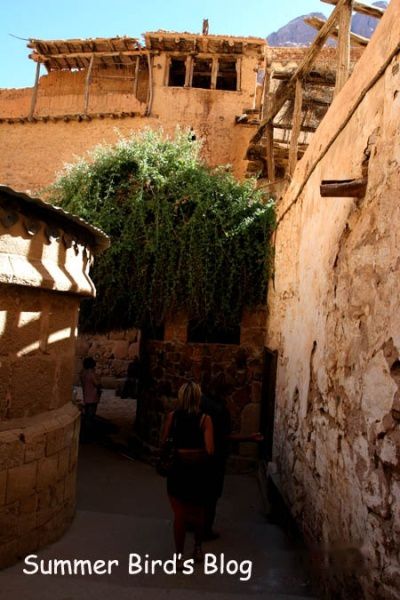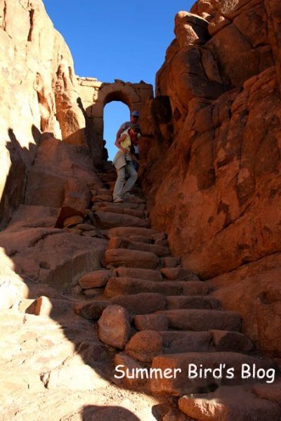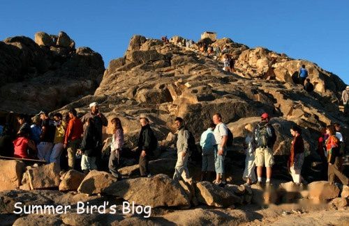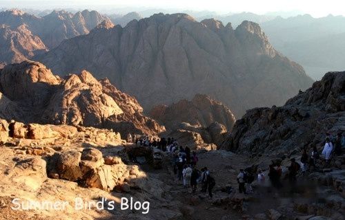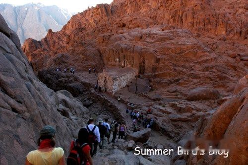 凌晨近2点,我们开始爬山。上山的路有两条,虔诚的朝圣者一定会选择攀登那3750级的“悔罪台阶”,据说这些台阶是一名悔过自新的隐修士挖凿出来的。这是一条最直接的路线,路上还有几个供朝圣者还愿的地方,包括一个“忏悔门”,从前有一名隐修士在这里听取朝圣者的忏悔。另一条路是“骆驼小道”,比较曲折,但容易攀登。我们走的就是这条道。当时同时出发的还有另外两批旅行团队,那长长的队伍在黑漆漆的山路上蜿蜒前行,远远望去,闪烁的头灯犹如跳动的萤火虫。牵着骆驼的贝都因人等候在各个路口随时准备为脚力不济的游客服务。三个多小时后,大队人马顺利登上山顶。