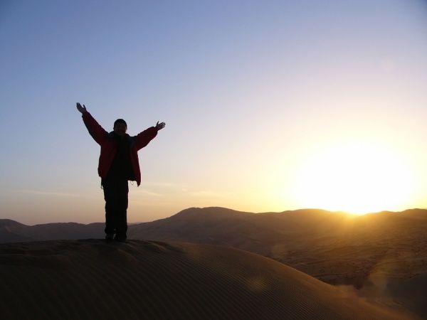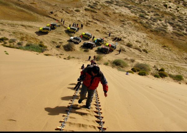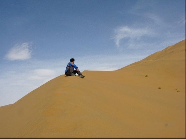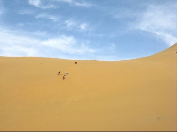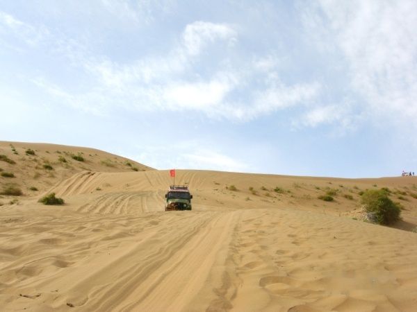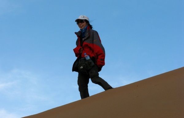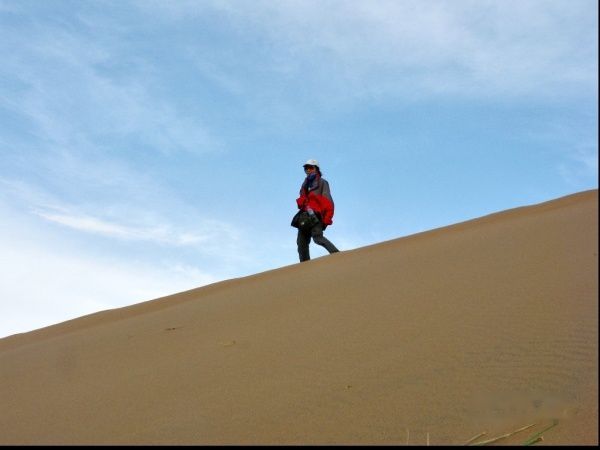 来到在一处高耸的山丘前,非常陡,我们只能徒步上坡,也就二三百米,开始也没当一回事,可是走着走着就全傻了:沙地又陡又软,走上几步都很吃力,最终用了二十分钟才爬上去,累得快不行了。