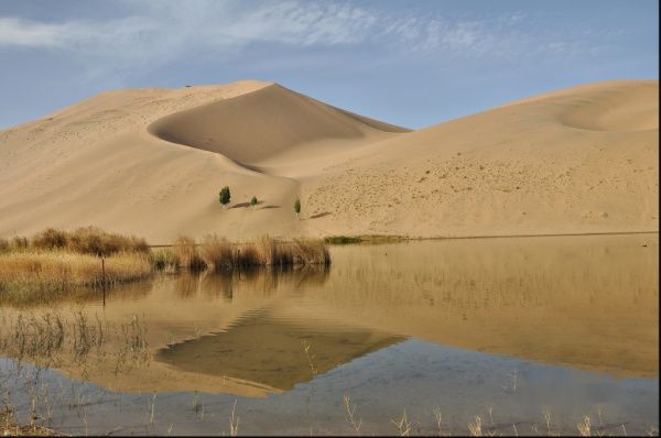 随后开车来到巴丹湖,附近一带绿洲茂盛,湖泊、沙山、倒影相得益彰,景致为沙漠最佳!