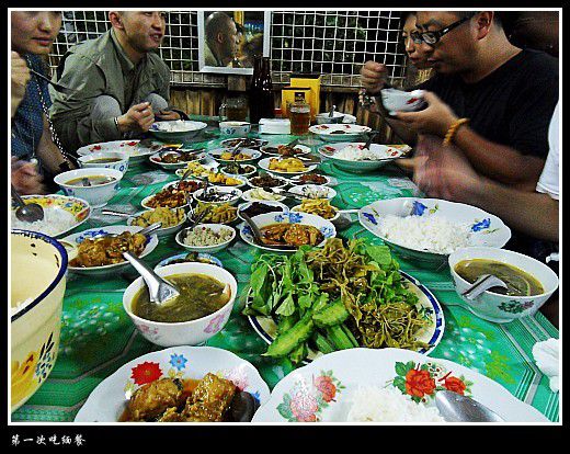 大家安顿好后,天色已晚,肚子也咕咕叫起来,一天来还没怎么吃饭,大家来缅甸当然吃缅餐,第一次接触缅餐,加上肚子也饿了,感觉非常好吃,缅餐跟韩餐一样,就没什么主菜,不是什么鸡就是什么鱼,开始时上一大堆小碟凉菜,然后才是主菜,味道偏酸和辣 ,接近云南风味。但人多,菜就多,大家一起吃、气氛也好,那天晚上吃得很爽!