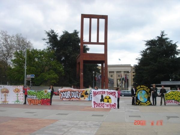 早上起来得不算早,从门口直接坐电车15路就可以到联合国欧洲总部。首先看见的就是断椅,70年代为了纪念那些被地雷炸伤的人而做的雕塑。联合国门口到处都是匆忙而行的人。突然来了一堆人,在断椅下坐宣传造型,仔细看,是说:拒绝炸弹,拒绝核研究,还世界绿色等等。。。