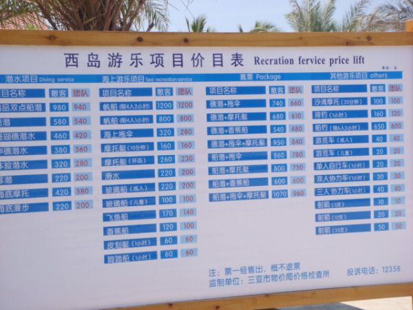 这是西岛上的游乐项目价目表,明码实价,当然了小声和导游砍砍价也是接受的哦。