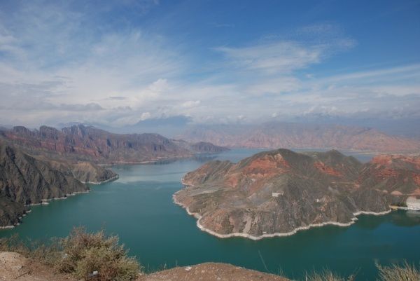 车子一路上坡,穿过隧道后就到达了坡顶,停车远眺,可望到整个李家峡水库拥护着如翡翠一般的黄河水,不能不说它是如此湛蓝、如此平静,如同圣湖一样给我一种视觉上的震撼,远处是阴云吹散后逐渐清晰的雪峰群峦。这里便是“龟山平湖”的景点。