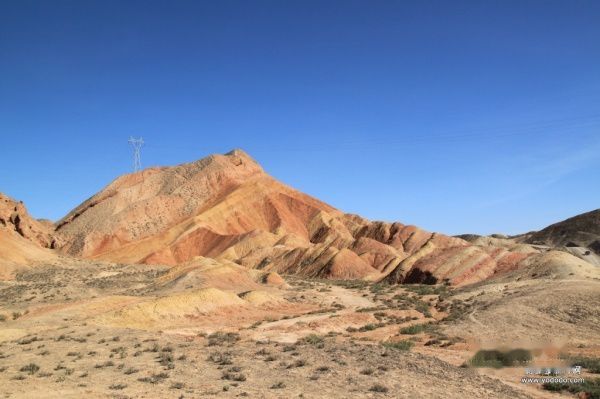 这是我们一进门看到的第一个彩丘。万里蓝天无云,衬着几百万年前形成的红红黄黄的彩丘,煞是好看。于是很兴奋地跑下车拍照。事后才发现,这第一个彩丘和后面的比起来,实在是小巫见大巫。