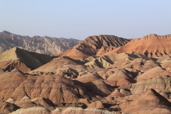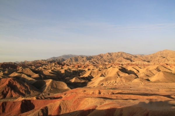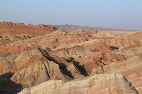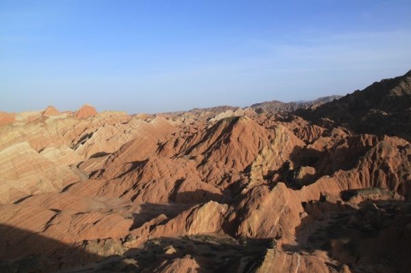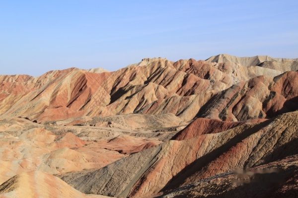 拐过面馆,进入到肃南景区,还要收一次门票,之后就来到了“刀山火海”。这一片彩丘很大,爬上各个山头,前后左右转一圈,可以看到不一样的景致。