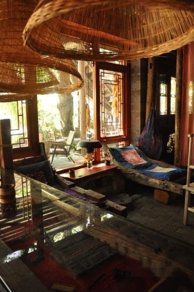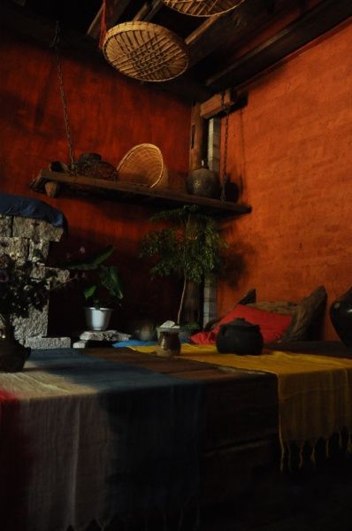 客栈的布置颇费了些心思。大厅被隔成几个小间,老旧的木质家具,扎染的艳色围巾被用来做隔断的纱帘。最别致的是几张木榻,配上艳色的布制靠垫,浓丽而妩媚。