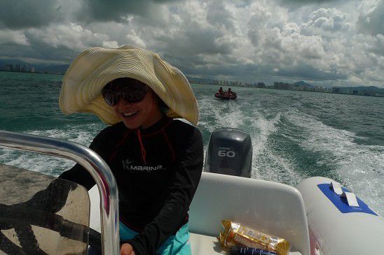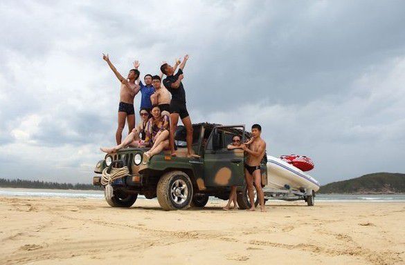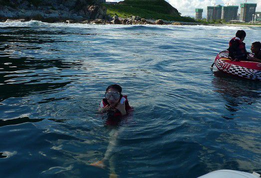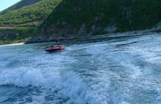 一天的活动行程安排就是在小唐领队的教导下我们自驾汽艇出海,香蕉船,滑水。早上8:30我们和小唐一起从天晴小屋旅舍出发,小唐皮肤有点黑,还挺帅的,人虽然话不多,但挺好的,我们上了小唐的吉普车,外观很有个性的吉普车,但是一路坐着这个车拉船的感觉,还是让我们着实体验了一把浪漫!那回头率也是相当的高啊!吉普车拉着我们今天要出海的汽艇去了一个无人沙滩。小唐他们在沙滩上扎扎实实给我们展示了一把什么叫做破是破,有气魄,那吉普车在容易被陷的沙滩里如履平地啊,然后我们看他们很娴熟的让汽艇下了水,小唐身体泡在水里往前推行了一段距离,我们挨次上了汽艇汽艇。看小唐坐在驾驶室的位置上坏笑的宣布,要开船了。我们感觉一阵后推力过来,随后就见自己在海上飞驰开来,我们跟着汽艇随着浪的起伏,也时上时下,感觉刺激极了。小唐还在船后拖了一个叫坐飞碟的东东,可以坐两个人,我朋友上去坐着,船启航的时候,后面就被拉着走了,随着速度越来越快后面的飞碟跟漂移一样,跟随我们船马达开的路线前进,就这样一边玩着,一边看着海景。在海上一路前进,景色越来越美,一路上还看到很多当地的渔船正在出海捕鱼,很快到了一个海湾。这是一片少被世人打扰的世外桃源,蓝天、白云、清澈的海水、洁净的沙滩、奇礁怪石,茂盛的原始热带雨林蕴藏着奇花异果。船在海外面停稳之后,小唐叫我坐上驾驶位,教我怎么使用油门,方向盘,告诉我这个跟开车一样,不要急转弯就可以,虽然我会开车,但第一次开船还是比较紧张的,当我在小唐的指导下,船在海上启动时,我的心情是无比的愉悦,原来加勒比海盗并非传说啊,咱也能开船了。这也是我这辈子第一次做船长。