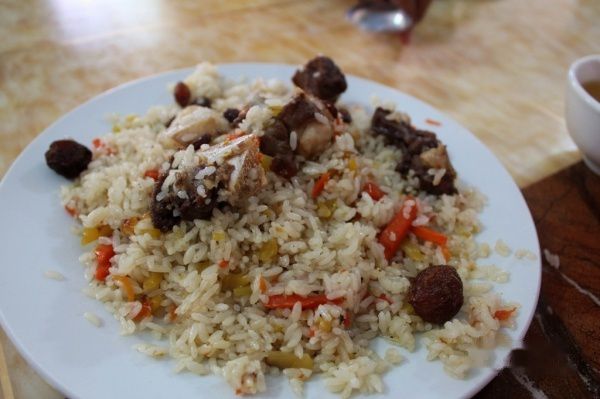 因为还没到午饭时间,吃饭的人不多,我们坐在靠近窗户的位置上,一位一身黑色长裙头戴花丝巾蒙面的女孩用很生硬的普通话问我们吃什么。看了点餐卡上呈列的饭菜感觉没有什么胃口,经卡斯木大哥的推荐我们点了三份抓饭,二十串小烤肉,一份维吾尔炒面,四份酸奶。