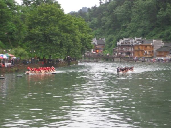 在大雨中穿梭于人群,只为找个地方可以看到,呵呵!反正我们心情好,管它下雨还是出太阳!看到隆重的龙舟赛,我们再拨电话给旅馆主人看他帮我们联系的苗寨一日游如何了,老板说今天时间太赶了,下午不出团了。得了得了,我们就乖乖把这一日留给凤凰古城吧!