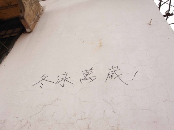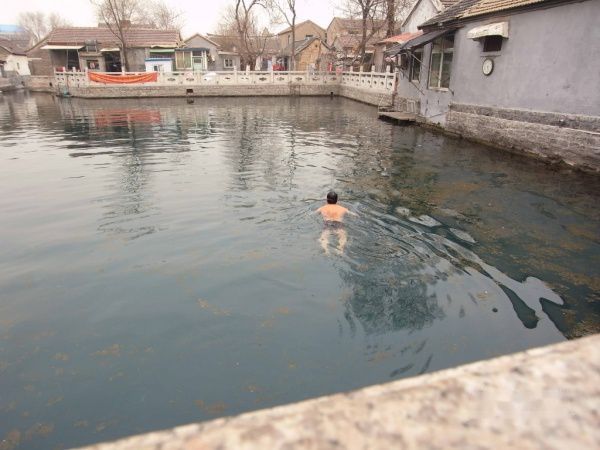 王府池子里有三眼泉朱砂泉、灰泉、濯缨泉,所以水量很大。具体几米深得去问那个蛙泳的哥们儿。嗯…..称哥们儿有点不礼貌,那里面游得正欢的应该是个隶属泉城跳水队的中年大叔。泉城跳水队,是一个非官方的组织,组长不详。集会地就在王府池子。我到时已是中午,大叔们准备回家吃饭,正穿着三角泳裤一边擦水一边神侃,墙上四个大字“冬泳万岁”让我乐了半天。