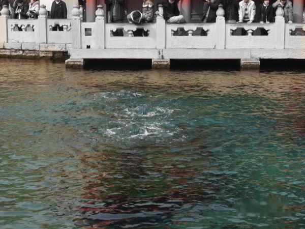 蹲在那个池子边,拍这些个小水泡真是费死劲了。那些小水泡从池底冒出来,扁扁的,一边上升一边左右晃着,然后到水面上,破掉,涟漪一圈。