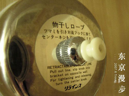 发现喷头旁边一个没见过的装置,是用来晾湿的东西的,把白色的头儿拽出来,里面是根线,对面墙壁上还有一个金属卡口,可以把白色塑料头固定住,就可以在线上晾东西了,不用时把塑料头摘下来,转一下金属螺丝就可以把线收回去。