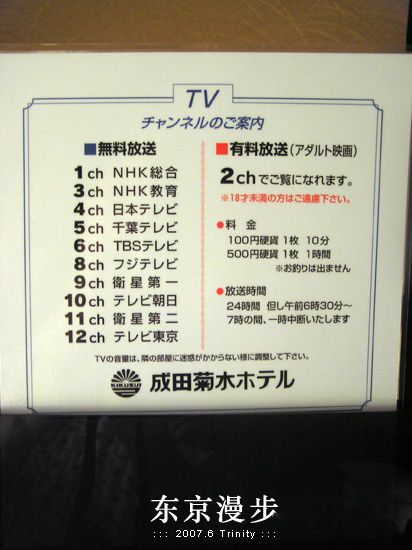 饭店里的付费电视节目单,就和**一起放在电视上哦~~ 明码标价,100日元10分钟,500日元一小时。我估计团里的老人们看见都会皱眉头,男的看见都心怀鬼胎一小下。。。清楚的特写我就不上了。。。嘿嘿。