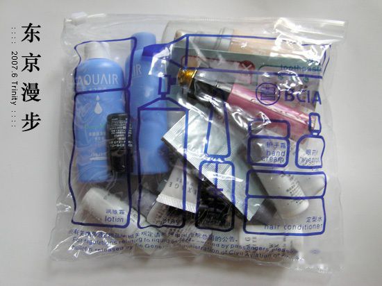 现在的安检多了一项很麻烦的手续就是液体检查,幸好出发前我在网上查了出国的有关注意事项,特地把所有这些零碎都精简整理好放在一个塑料袋里,到了机场拿了标准袋子一倒就行。