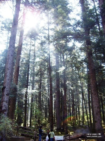第二天一大早,小刘把我们接到了九寨沟口,沟口居然人山人海,买好票办妥两次入沟,便搭乘沟内的观光电瓶车到了日则沟最深处的原始森林。刚才还人山人海的游人一入沟仿佛就呼地一下散开不见了踪影,九寨沟即便是旺季依然无比清幽。海拨3000多米的原始森林空气清新,深吸几口感觉神清气爽。清晨的缕缕阳光透过森林照射下来,隐隐现出一抹彩虹。