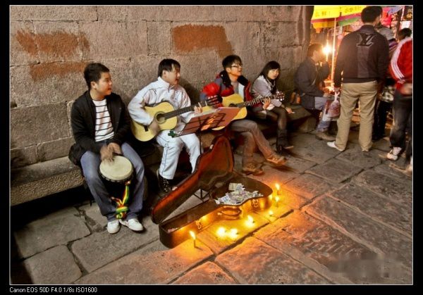 在凤凰夜晚靠歌曲出门闯荡的年轻人。
