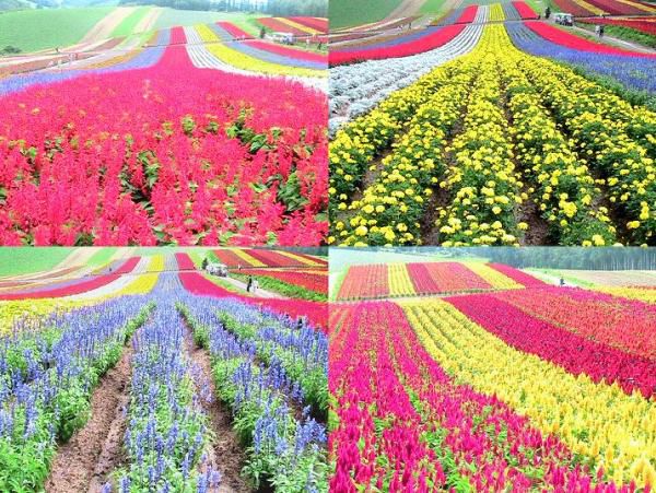 来到“四季彩之丘”:“以雄伟的大雪山峰峦和丘陵的景色为背景,铺展开了7公顷的花圃,景致超群。从春天到秋天,能看到30种不同种类的花卉。”