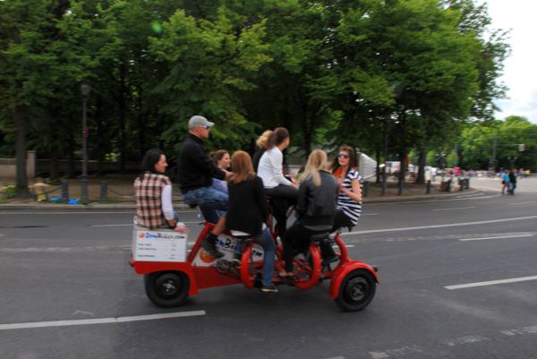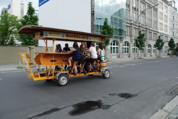 绝大多数自行车都是一个人骑,在一些旅游景区见过2人骑的自行车。最多人是在阿姆斯特丹见到夫妇两人带着孩子骑自行车,也就3个人。到了柏林,看到8个人,甚至10个人骑的自行车,算是开了眼界。当然,这类车只是用来游玩的。