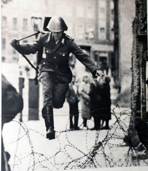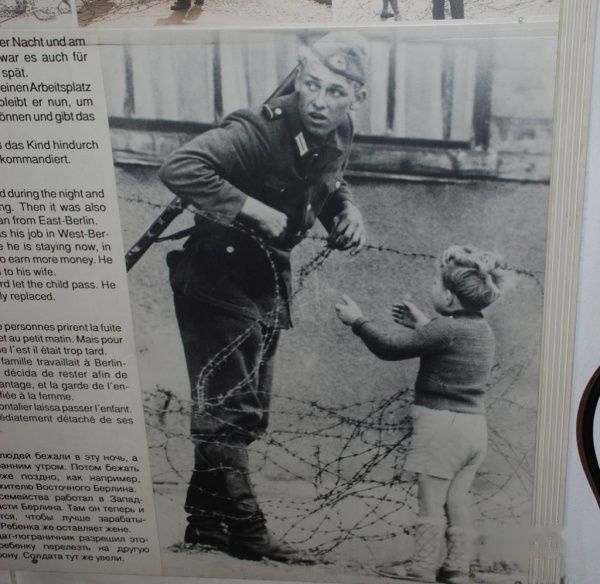 看守柏林墙的士兵,也有善良的,图为帮助一个孩子越过铁丝网的士兵。你看一面掀开铁丝网,让孩子过去,一面又警惕地张望,生怕被人发现而使自己遭殃。