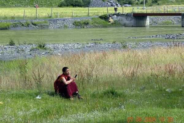 路边小憩玩手机的小喇嘛