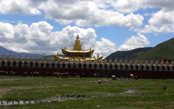 这儿据说是班禅的行宫,金碧辉煌,背后是雄伟的雅拉雪山。