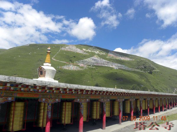 过了此处,路又变为土、石路面,崎岖不平,车摇摇晃晃前行两个多小时,来到塔公草原,“塔公”:藏语意为“菩萨喜欢的地方”,这里有藏区著名的花教寺庙--塔公寺,传说是文成公主入藏时途经此地所建,并将随身所带三尊“觉巫”送与寺庙,故它在在藏传佛教中的地位很高,据说,信教群众若不能去拉萨朝拜佛祖,但能到塔公一拜觉巫,同样是功德无量的。每年农历六月三十举行盛大的佛事活动,庆祝“释迦摩尼降魔成功”各地百姓纷纷云集朝拜、转塔、观看跳神乐舞,盛况空前。