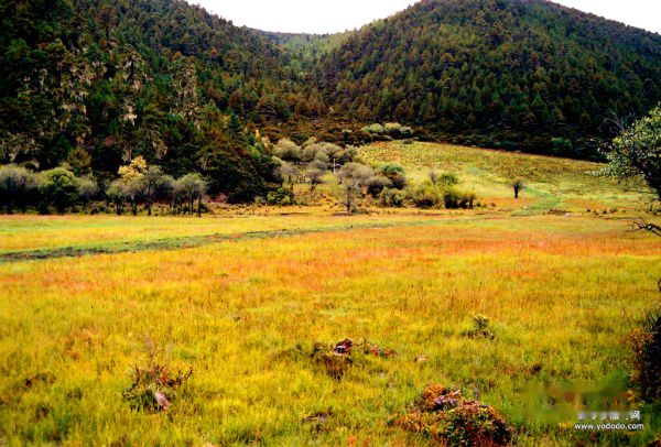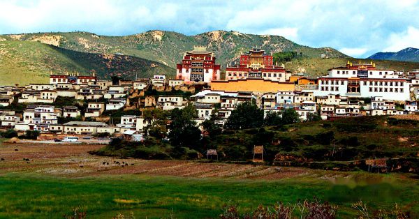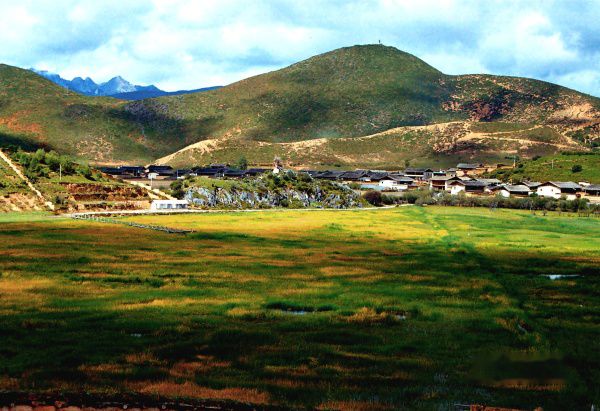 松赞林寺下面的草甸及民居,远处应该是云岭雪山。