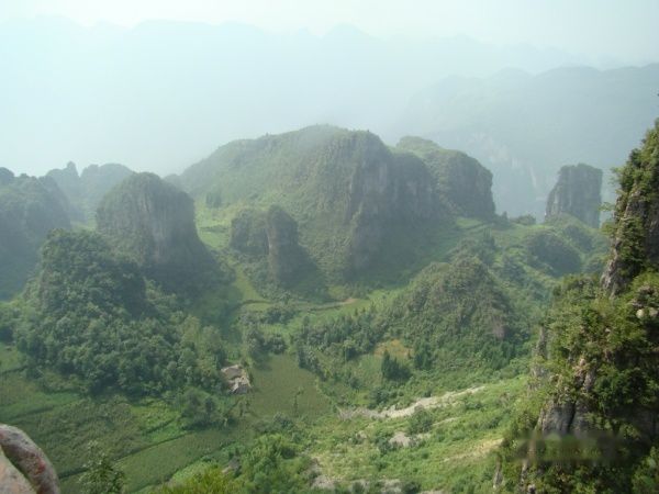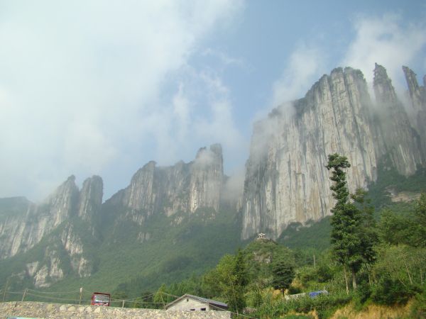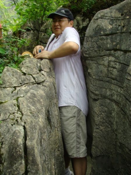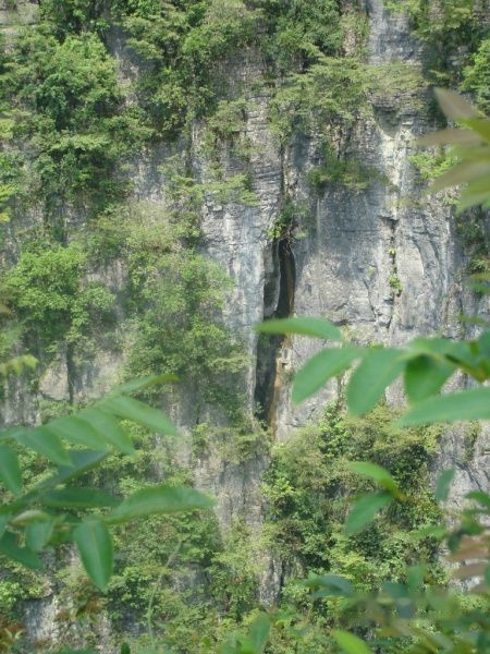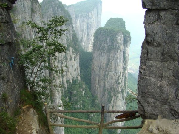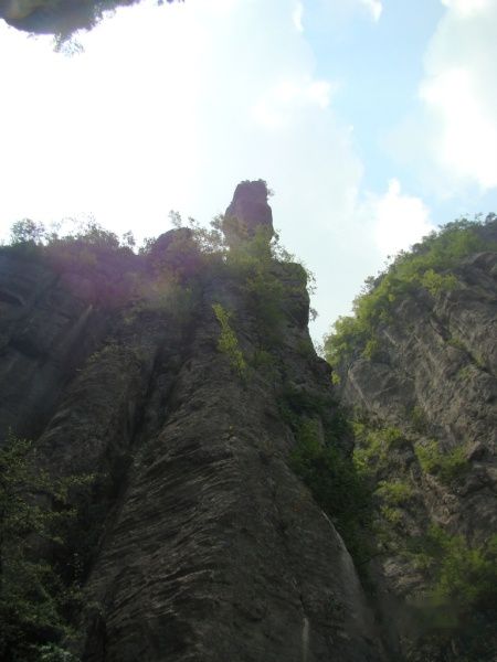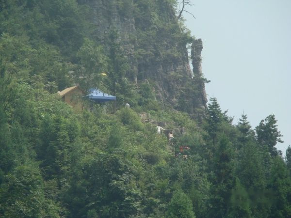 嘿,从这里望去,那崖边屹立的巨石和奥运火炬还真有几分相似。“那蓝色的屋顶就是我们一会要通过的最高点了。”导游这时的预告真不知是为俺们鼓劲哪还是为俺们泄劲。看来要想到达那个位置,我们首先还得下到沟底。
