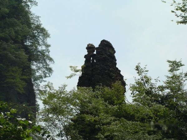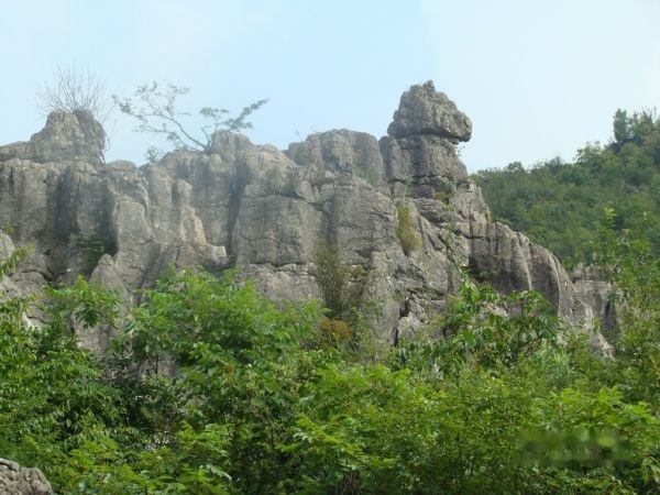 越过这令人生畏的栈道,路边的山矮了许多。不过山上的奇景却令人生疑,你看山顶那似图腾一样的砾石组,居然是天工所赐。如果不是导游亲口所言还真不敢相信。
