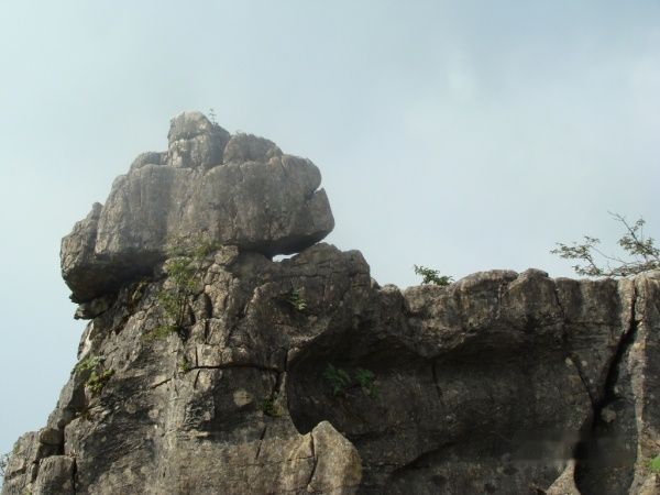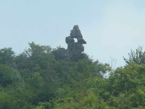 虽然是三伏天里登山,又是个大晴天。可气温却出奇的适宜,才不到28度,再加上山间的小风一吹,那真叫一个爽啊。不一会的功夫,我们就来到了一片奇石的脚下。这里的石头个个都像个物件,最奇的要数这堆石头。从山下仰望(左图)就似麒麟把山,从山上向下俯瞰又似雌狮回眸。站在石旁眺望,一览众山小的感觉不禁油然而生。