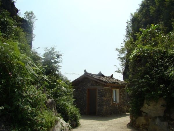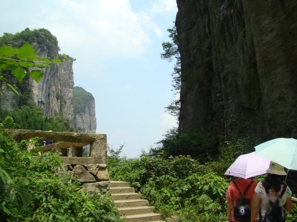 这中门楼也是一个山口,山口一侧的小屋是为看山人建的休息室。现在这里成了山民向游人们兜售他们山货的好地方。每一个走到这里的游人都要停下来休息一会,山民则正好乘机推销他们的产品。过了中门楼,山路就在峭壁一侧的灌木丛中不断地向前延伸着。如果不是对面那陡峭的山崖,你还真以为自己已走到了田间的小路上呢。