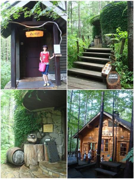 每个小木屋中的工艺品都有着特定的分类,有的是纸,有的是木头,有的是玻璃,小巧精致而又手工气十足的可爱。门前也有挂牌写着可爱的名字,如[森の革工房],基本都和[森]有关。有一家店专门是卖各种各样万花筒的。虽然是买伴手礼的好地方,但价钱。。。真的不便宜。。。。一个小小的东东就要好几好几百=口=。。。无奈路过。。。。看过各式工房,又去到大名鼎鼎的[森之时计]咖啡屋前留影。