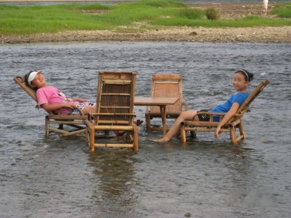 潮妈也忍不住脱了鞋下水躺在水中的竹椅上休息。这种日子好巴适哦