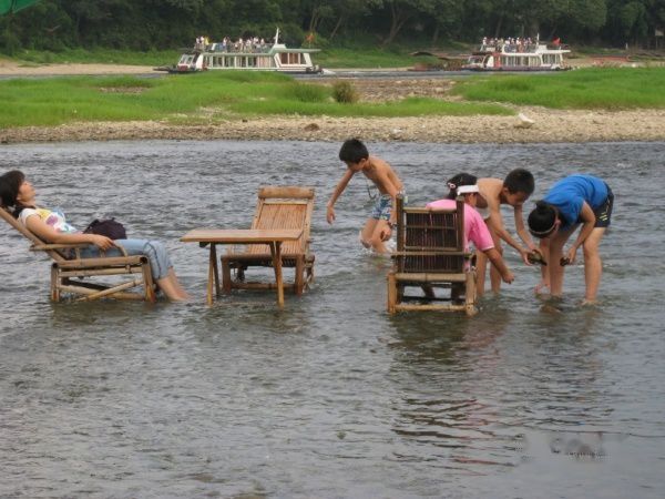 江边浅水区,卖烤鱼的小贩摆着的小摊子,暂时没有食客,我们来坐坐,好舒服哦。卖烤鱼的老板真是非常友善,任我们坐,也不怕影响自己的生意,孩子们几次还差点把老板的遮阳伞给弄翻,她们也没有生气,事后我们都说,要是在咱们家乡,一般你才坐下去,马上老板会来说,一坐一茶哟……广西人真的不错,很好!