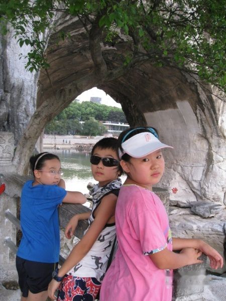 三个同学合影,背后就是象山水月洞哈,就是象鼻子下面那个洞。 从象山公园出来,已经是七点多了,一众人马已经有些累得没精打彩了。赶紧找地方吃饭。之前计划好的去酒店旁边的小南国或者金龙寨,到底去哪家吃呢,孩子们正在点兵点将拿不定主意,妈妈们问了路上几个当地人,居然异口同声地都让我们去小南国,OK,直奔小南国。哇,人河真多也,不过虽然人多,但服务还是跟得上,很快菜上来了,这一餐,是我们此行公认吃得最好的两餐之一,另一个当然就是在全景楼的晚餐啦。小南国的味道好,价格也不贵,我们点了一个汗蒸鱼(才49元),木瓜雪珂猪肺烫煲,炒鸭舌,铁板牛肉,麻婆豆腐等大概七八个菜,味道很巴适,吃完结账,239元,不错,满意!