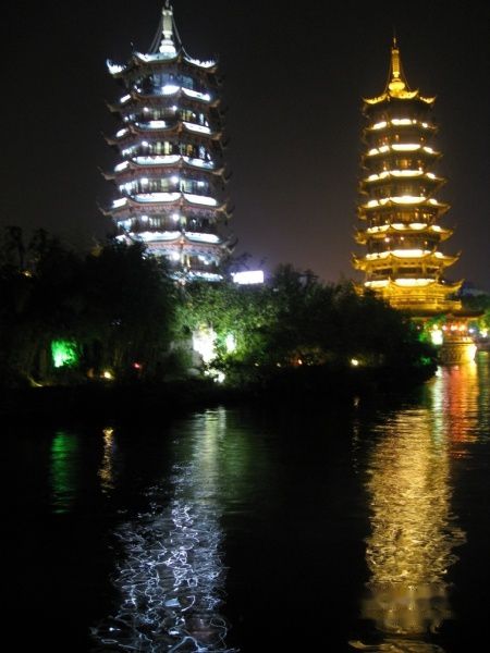从小南国出来,原计划当天晚上还要游两江四湖的,可是孩子们在江边呆 的时间太长了,快九点了,就只在对面的金银塔,榕湖边上散步,走了走,然后回宾馆休息。明天,将是最吸引我们的漓江精华竹筏游了哦。