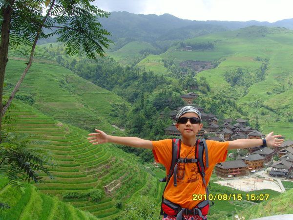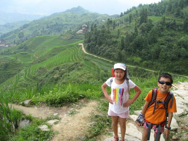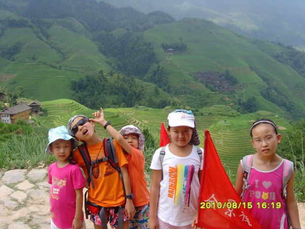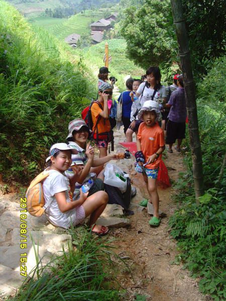 8月15日:早上7:30,全体在大厅集合,孩子们还是不错,虽然睡得晚,但都早早起来了,作为本次妈妈儿童团的财务总管凡妈负责退房、结账,潮妈带着孩子们到宾馆马路对面快乐米粉吃早餐。我负责将部分行李寄存在总台,准备轻装上阵登大寨。吃上了传说中的桂林米粉,味道真不咋滴,吃的人还满多。后来又吃过几次米粉,始终未发现特别美味的,估计我们是没有去到网友们推荐的那些专业的米粉店。8:40,全景楼的大巴车准时开到宾馆门口来接我们,原来以为只是一个山区旅店的接送车,一定是那种破破烂烂的小中巴,没想到是辆崭新的蓝色旅游大巴。接到我们后,直接去了桂林火车站广场等别的游客,不一会儿就满当当一车,还上来了四个老外,我旁边坐了一妈妈,抱了个六七岁左右的小女孩,上车还在吃早餐—米粉,事后没想到还发生了些小插曲。9:00,大巴车上路了,还没出城,就看到了视线内突然冒出来的一座座不高的小山, 是桂林特色的那种石头山,很特别,我们在四川看惯了的都是真正的高山。