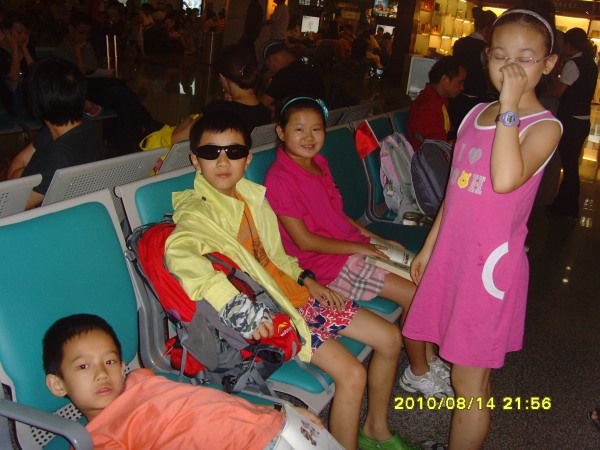 8月14日:尽管飞机是晚上九点半的,可好好一大早开始就在家兴奋,由于是要跟同学一起出游,高兴得很,自己在家做了一个倒计时牌,提前十几天就开始倒计时,今天就是倒数几小时了。下午在家好好坐了三面小红旗,分别写了三个同学的姓,还写上了“一起去看刘三姐”,搞得跟真的旅行团一样。晚饭后在外公外婆的千叮万嘱下,早早下楼,等川航的免费中巴来接。8点左右就跟凡凡和凡妈一起就到了机场,两个小女生早就商量过要换座位在一起,路上要聊她们的悄悄话,很顺利换到了第六排。刚换完,一转身,好好眼尖就看到了嘉潮嘉坤两兄弟和他们的潮妈。两兄弟一人身背一个大的旅行包,头戴魔术巾、墨镜,很时尚的出行打扮哟,几个同学见面自然是非常热闹,三家人都不约而同地注意了行李的准备,没有托运行李,因为航班晚,怕取行李耽误时间麻烦。过了安检,嘉坤才想起相机还在家中充电忘记带了,汗,被潮妈批评才晓得,人家两兄弟的旅行包全是自己清理准备的哦,家长一点没检查的,很独立哟,我们家的小美女可是基本没管过的哈,好在潮妈带了摄像机。出行前在机场给他们四个小朋友来一个合影。