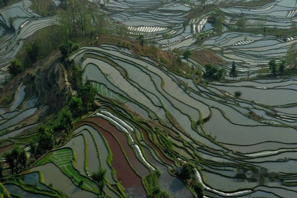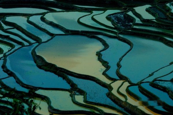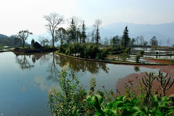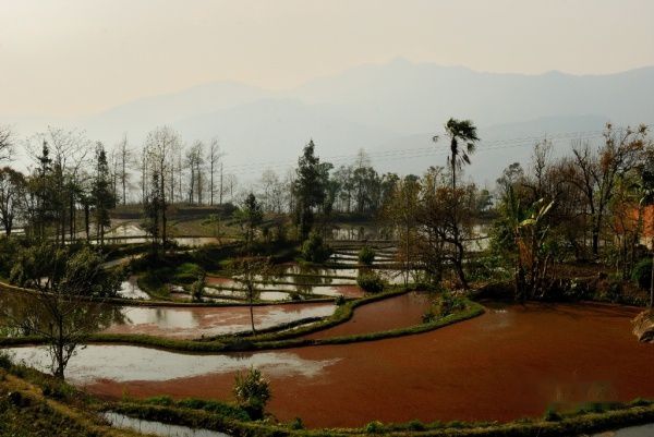 安排好住宿大约下午4点,在路旁截了辆三轮农用蹦蹦车去龙树坝(因路况差,面的不去)4个人往返50元。从客运站走一条乡间的土路大约2.5公里就到龙树坝了。龙树坝的梯田因水里的含养成份跟其它地方的梯田不一样,所以多红色浮萍。拍出片子又是一番情调。