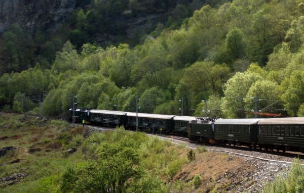 挪威的铁路为国营。挪威国营铁路公司,简称为NSB。而弗洛姆铁路却为私营。挪威政府并没有因为其赚钱,而将其收归国有,实行“国进民退”。在短短的20公里路程中,从海拔只有2米的弗洛姆上升到海拔866米的米达尔。我买的是欧洲铁路通票,虽然不能用于这段私营铁路,但可享受7折的优惠。铁路在山谷间穿行,中间火车还停了一次,避让对面开来的列车(因为是单轨)。远处穿黄色背心的就是扳道岔的工人。