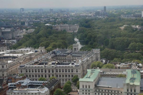图为白金汉宫、詹姆斯公园和白厅。远处河的上方是白金汉宫。前面的建筑好像是政府所在的白厅。